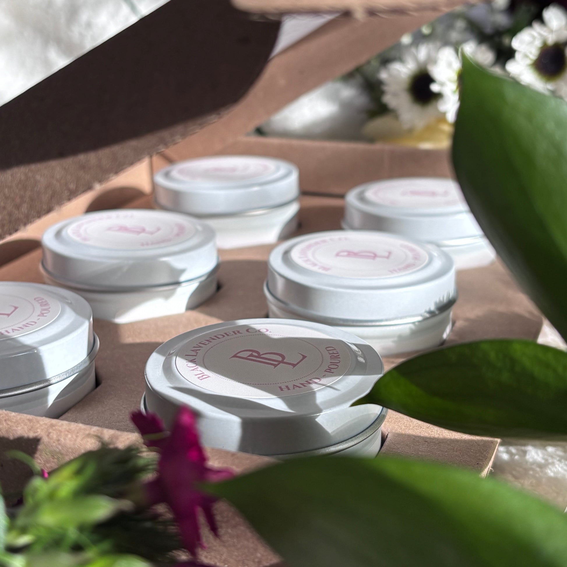 Each box includes six variety of 1.5 oz soy sampler candles, hand-poured in a sleek white tin, one lead-free cotton wick, and an informational label inside with a breakdown of the scent notes for each blend, so you'll know exactly what you're sniff'n!