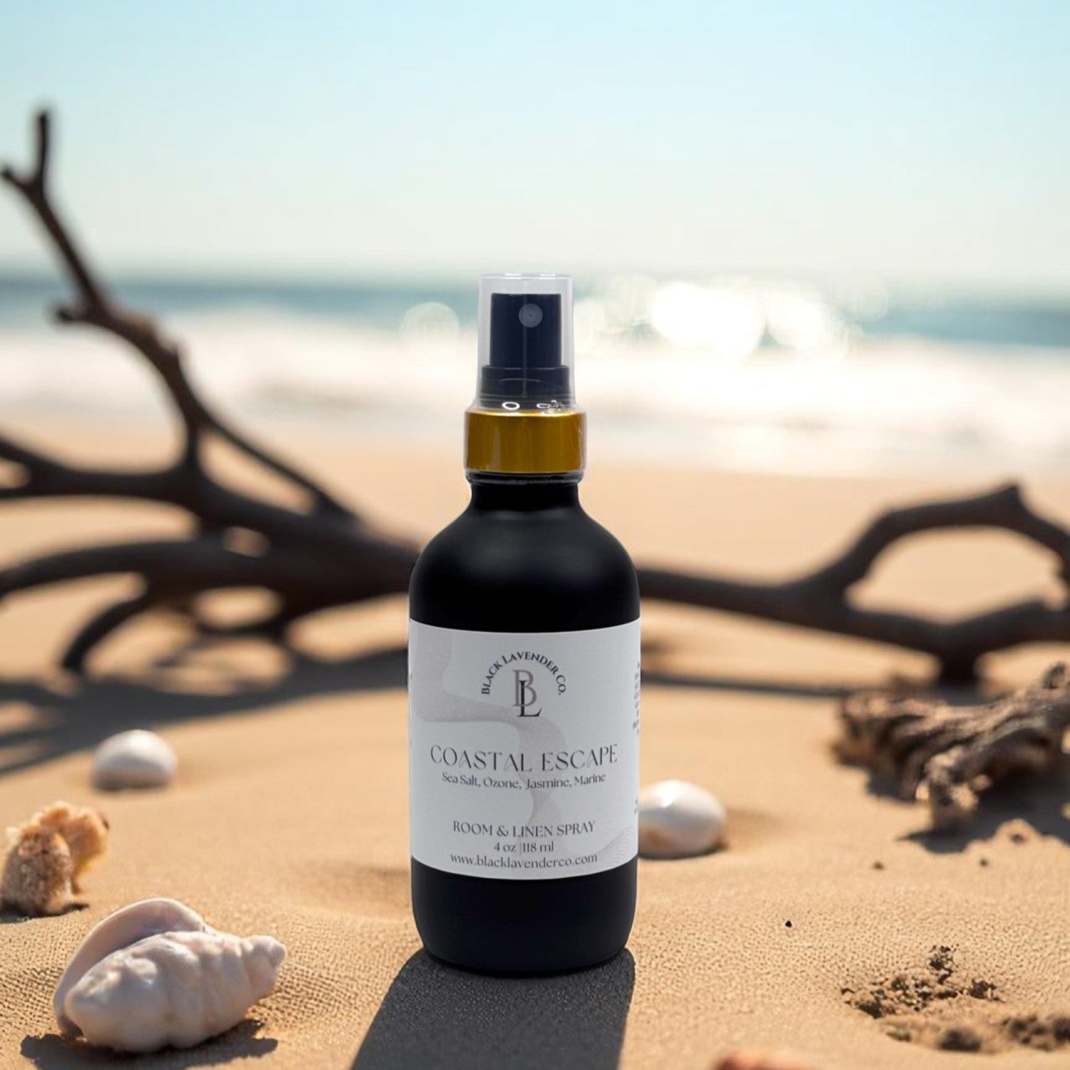 Our 4 oz room & linen sprays are hand blended and poured into a glass matte black jar with a black & gold spray cap.