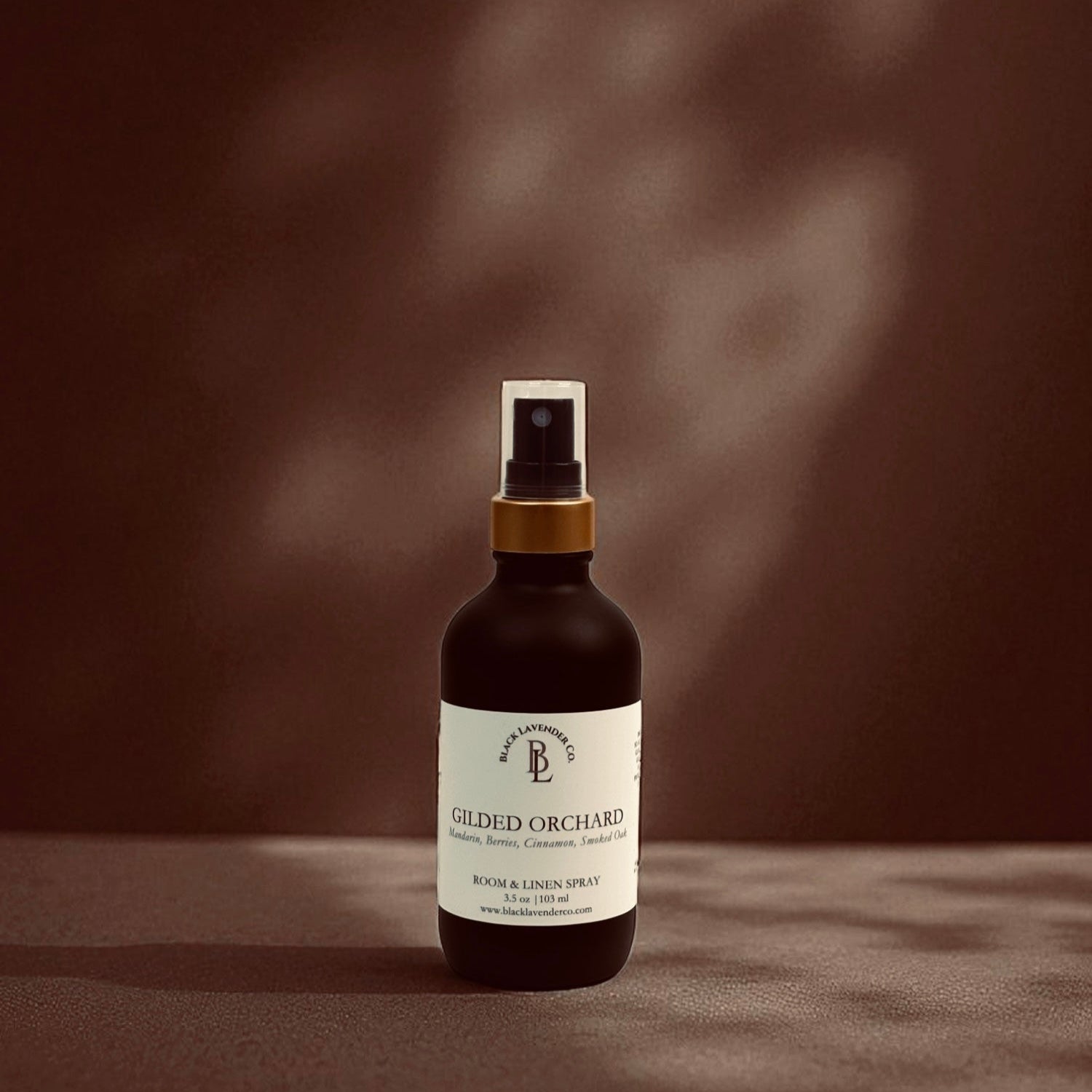 Our 3.5 oz room & linen sprays are hand blended and poured into a glass matte black jar with a black & gold spray cap.