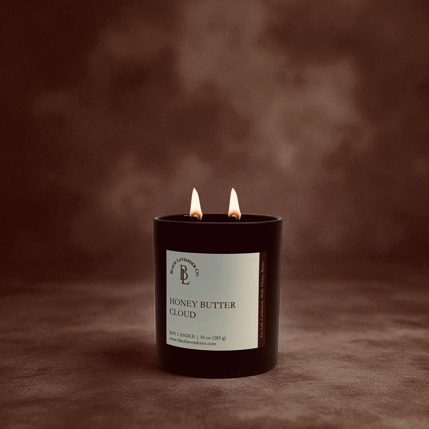 - 10 oz. double cotton wicked matte black jar with a bamboo lid (This size is perfect for filling medium to large sized living areas). Burn time of 50+ hours