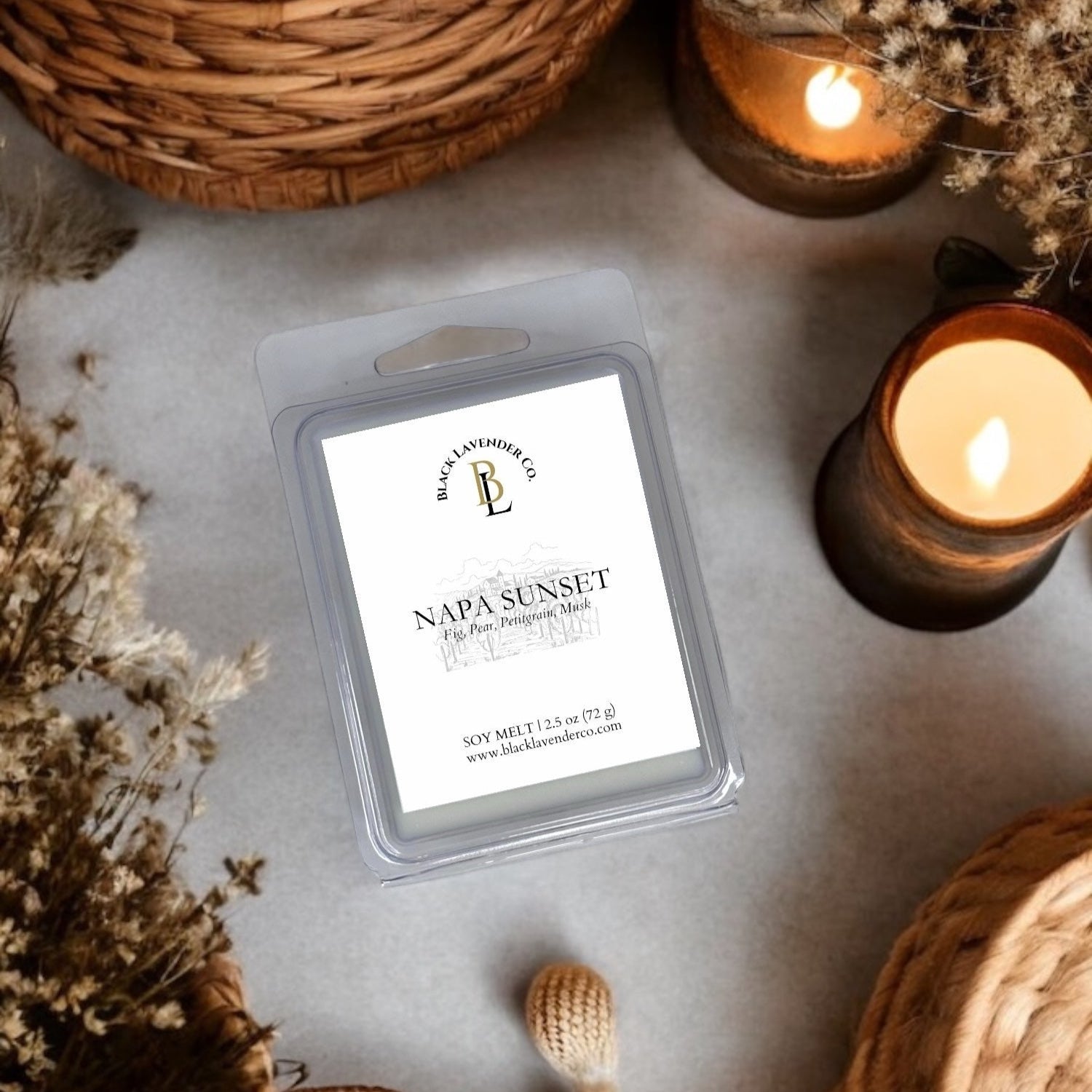 Napa Sunset is that golden hour glow in scent form. Juicy pear and ripe fig open the air like the first sip of crisp white wine on a vineyard terrace. Petitgrain adds a fresh, green twist, like a breeze slipping through citrus leaves, while a smooth touch of musk lingers like sun-warmed skin after a day in the vines. It's the scent of winding down, glasses clinking, and everything bathed in amber light.