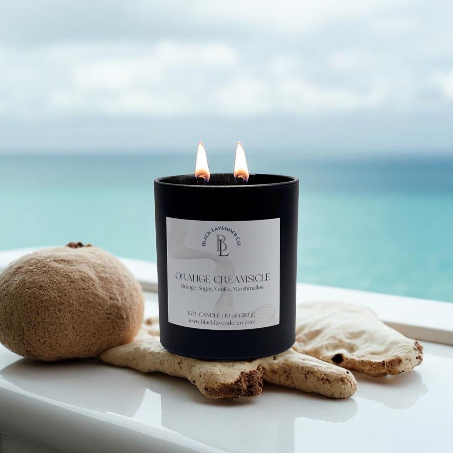 • 10 oz. double cotton wicked matte black jar with a bamboo lid (This size is perfect for filling medium to large sized living areas)